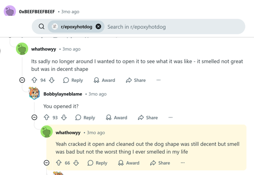 Last update: https://old.reddit.com/r/epoxyhotdog/comments/y3p3ix/2_year_update/