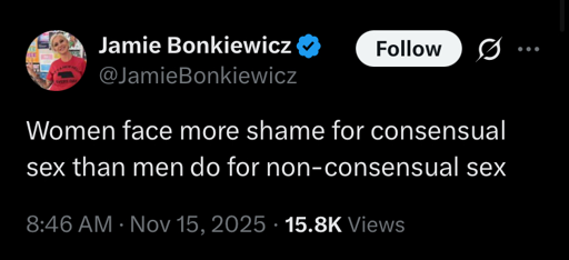 They absolutely do not, unless you start playing with what, ‘consensual’ means. They may feel more shame than those men do, but the kinds of people who grape others generally don’t feel shame, in general, so even that comparison is poor. Additionally, shaming isn’t the primary tool society uses to respond to grape, assault, prison, ostracizing or murder is, so like, so what is there less shame? Shame is what gets used when physical force isn’t acceptable.