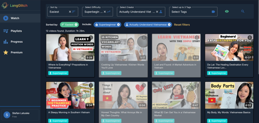 So I decided to build something for myself and ended up turning it into a proper project: LangGlitch – a little web app that aggregates comprehensible‑input videos for language learners. Right now it supports German, Vietnamese, and English, with playlists grouped by difficulty, tags, and creators. You can sort for “easiest”, filter for topics you like, and then just watch your way through material instead of hunting for the next decent video.