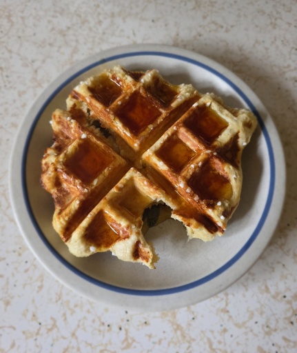 Liege waffles are made from Brioche (yeasted & risen), so the dough is very dense and they have pearl sugar mixed in which gives them a delightful crunch while you eat them! Apparently you don’t normally add toppings, but maple syrup is too delicious for me to worry about the mild anachronism.