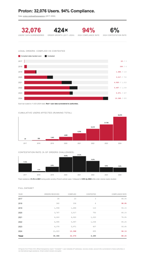 ☆ Yσɠƚԋσʂ ☆@lemmy.ml to Privacy@lemmy.mlEnglish · 16 days agoProton has handed over 32,076 users' data to governments since 2017. Their own transparency report states a 94% compliance rate in 2024.lemmy.mlimagemessage-square40fedilinkarrow-up1127arrow-down116