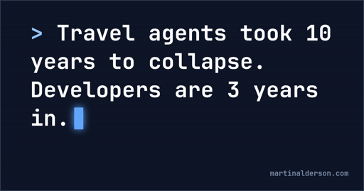 The other move is to broaden. If you’re a backend engineer who’s always avoided frontend, now’s the time - agents can bridge the gap while you learn. If you’re frontend-only, lean into backend, devops, infrastructure. The engineers I see thriving are the ones who can own an entire problem end-to-end, not just their slice of it. The generalist travel agents got wiped out, but the generalist engineers - the ones who can move across the stack - are more valuable than ever.