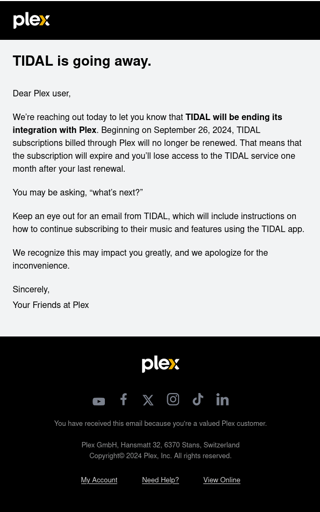 We can confirm that since your account was activated with TIDAL Direct billing, you can still use the Plex app, and since the partnership will be concluded at some point, it won’t work any more.