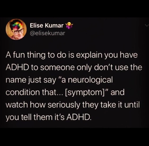 I strongly believe that a friend of mine has undiagnosed ADHD. The degree to which everyone around him keeps saying, “he’s not atypical, he just to stop being a fuck up and commit to something” is frustrating. My man needs treatment, not tough love.