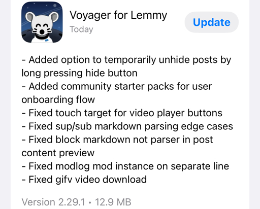 Blaze (he/him) @lemmy.dbzer0.com to Fedibridge@lemmy.dbzer0.comEnglish · 8 months agoVoyager Adds Community Starter Packs!lemmy.caimagemessage-square9fedilinkarrow-up1132arrow-down13