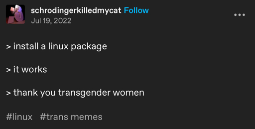 There seems to be an oddly large overlap (tbh I’m not sure if just in memes or in real life) between linux users (particularly arch and nixos), foss devs, and lgbt+ people (also rust, nim, and go devs lol).