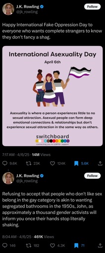 But since she’s revealed that she’s also a horrible person, I feel like it’s worth pointing out that she’s also a horrible writer. Everything good that she put into her books is lifted from something else. The stories are meandering wish fulfillment, barely coherent and hardly ever internally consistent. Her twists are either telegraphed and obvious or non-sequitur. Her characters are one-dimensional caricatures, and the only reason they are so beloved is because they were crafted into films.
