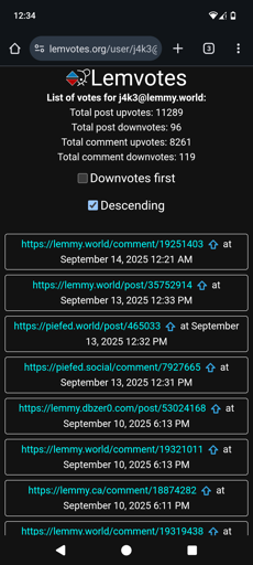 - I get really surprised going through my up- and downvotes. Seems sausage fingers and mobile app leads to interesting votes sprinkled in with the ones I’ve actually voted for. - Pretty neat layer of obfuscation, though I can’t imagine being interesting or infuriating enough for anyone to go through my voting history. - If it were to happen, I hope it’s because of some shitpost of epic proportions. - There was another instance that revealed all the data by post/comment. Far more useful to see if s post is getting brigaded, etc, or to see maybe if you have a wierdo stalker. - I just can’t remember what the instance was.