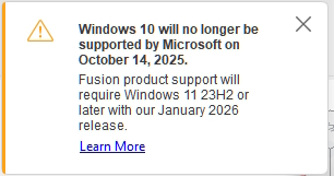 **What does end of support mean for Windows 10 and Fusion?** Fusion will continue to work on Windows 10 after the 14th - however, Autodesk will no longer consider Windows 10 for validation, bug fixing, and product support of future releases. Application compatibility and support will not be guaranteed for this platform for releases after this date.I think I remember people saying they got it working with this