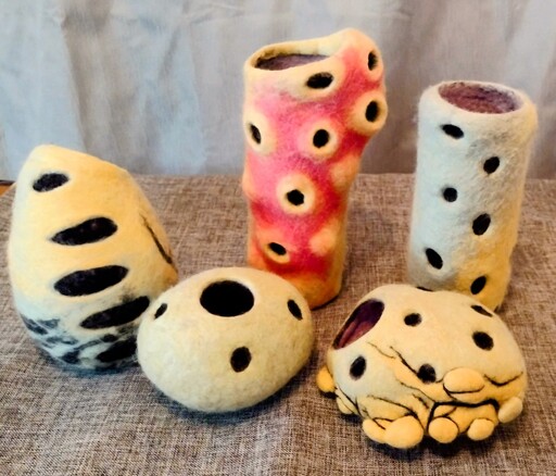 Everything is wet-felted and made on a whim without much planning. I make forms from old reusable grocery bags, use balloons or bottles to hold their form while they dry, and create the voids between layers with coins, wood scraps, trash and marbles. I use felting needles and an electric pube trimmer to clean them up.