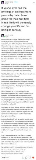 I have several trans friends (am cis woman myself) and I take photos at a lot of local fests and I like to make an extra point to get really nice photos of the trans people in our community smiling because I think they truly deserve it, and it always makes me extra happy when I see them use my photos as profile pictures :)