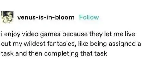 Completing tasks in games? That’s unheard of, I just jump between quests lol
