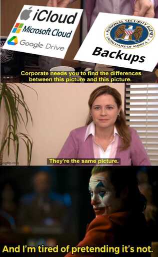 The average user dosent active encrypts anything. If you are the person who active makes backups and encrypts them, then you are probably hosting them yourself too. This meme talks more about people uploading there whole phone gallery onto