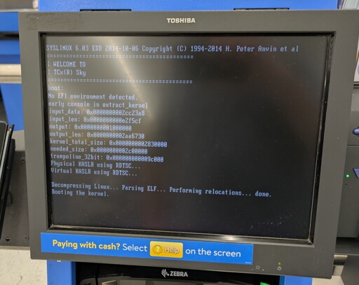 IDK where this is, but I repaired self checkouts in Oklahoma and Texas for years and they all had Windows. The regular registers looked like this when they booted. But going off the way the surrounding hardware is facing the same direction as the screen and what looks like a debit reader barely visible on the left and the printer on the right, it does look like a self checkout, just not one like I’ve ever seen.