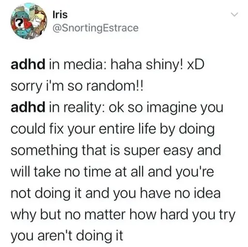 I genuinely wonder if that is how it works for neurotypicals. Like, is the only way they can fail if they consciously decide that they don’t give a fuck about something?? Can they just be told “Apply yourself” and go “You know what, maybe I will” and then magically improve?? That sounds completely outlandish…