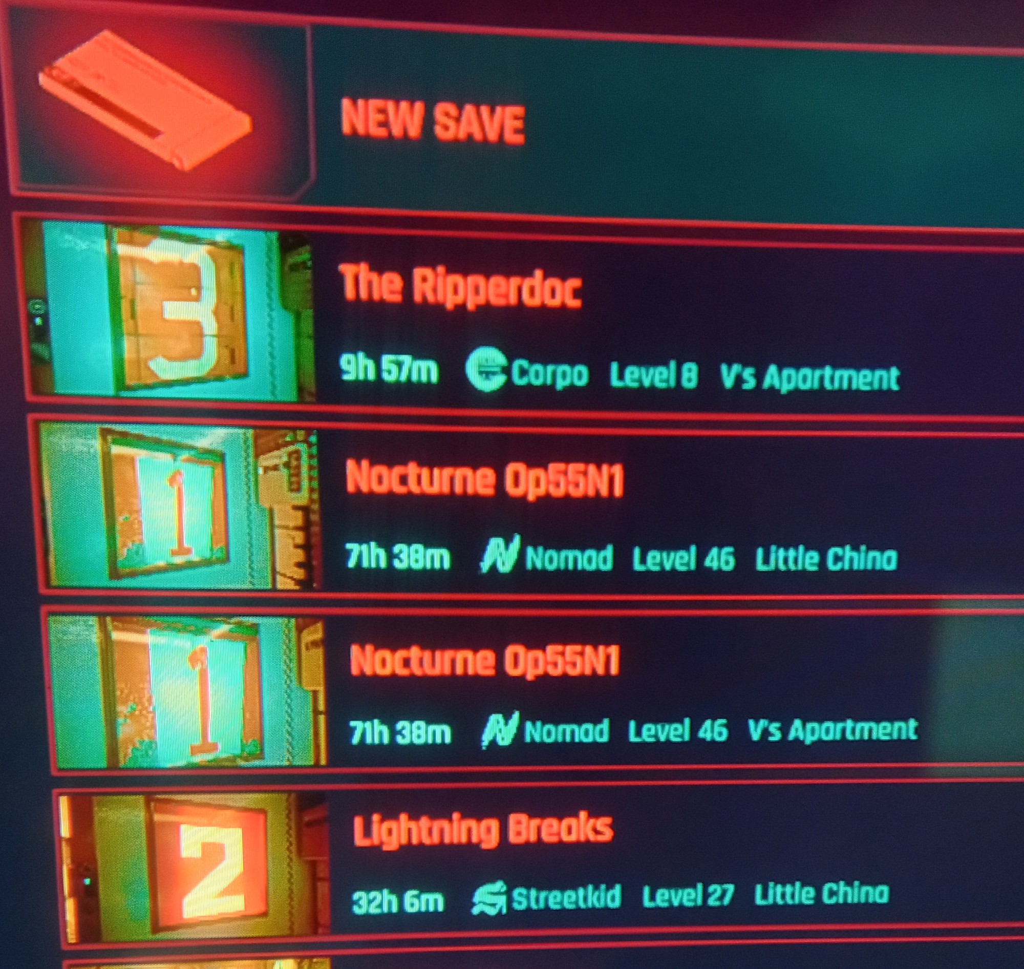 It kills me that the game just lobs all the saves together without any way to quickly tell them apart. So I took pictures of some numbers around the city, and put the appropriate one in the stash frame in the default apartment for each playthrough.