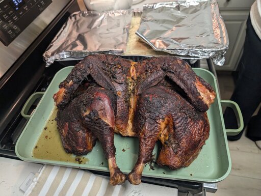 The turkey was ethically raised and harvested by a local farmer. I know that’s not as ethical as raw veganism obviously, but in fairness there is no ethical consumption under capitalism so I strive to exploit shit “less”. I will not, for instance, support the commercial fishing industry and I won’t eat factory farmed meat. That turkey had a pretty good life for a turkey, it was safe from non-human predators, it always had enough to eat, and the farm is huge with plenty of space to range. Even in death it’s sacrifice fed an entire family and nothing got wasted, which is more than most human beings do.
