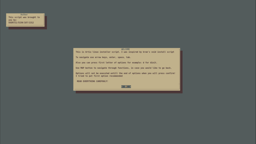 cm0002@lemmings.world to Linux@programming.dev · 2 days agoTUI Artix Linux Install scriptplus-squarelemmy.mlimagemessage-square2fedilinkarrow-up128arrow-down11
